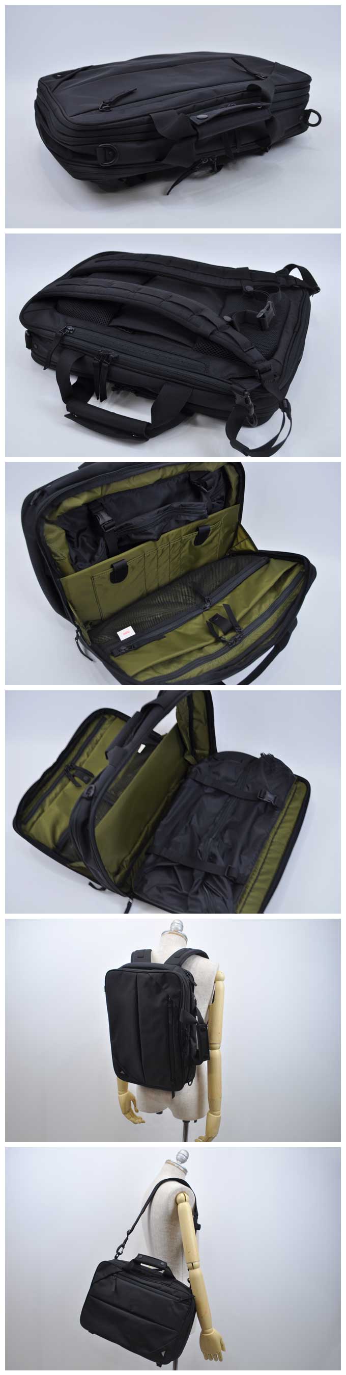ビジネス対応可能な機能性に優れた 3way 仕様のバッグ。サイドについたファスナーの開閉でマチ巾が約70mmほど拡張します。 同程度のスペックの素材と比べ約 20% 程度軽量な中空ナイロン 840d を採用しているため、軽量性に優れています。背面の上下ジップを開けて、キャリーバーに対応しています。